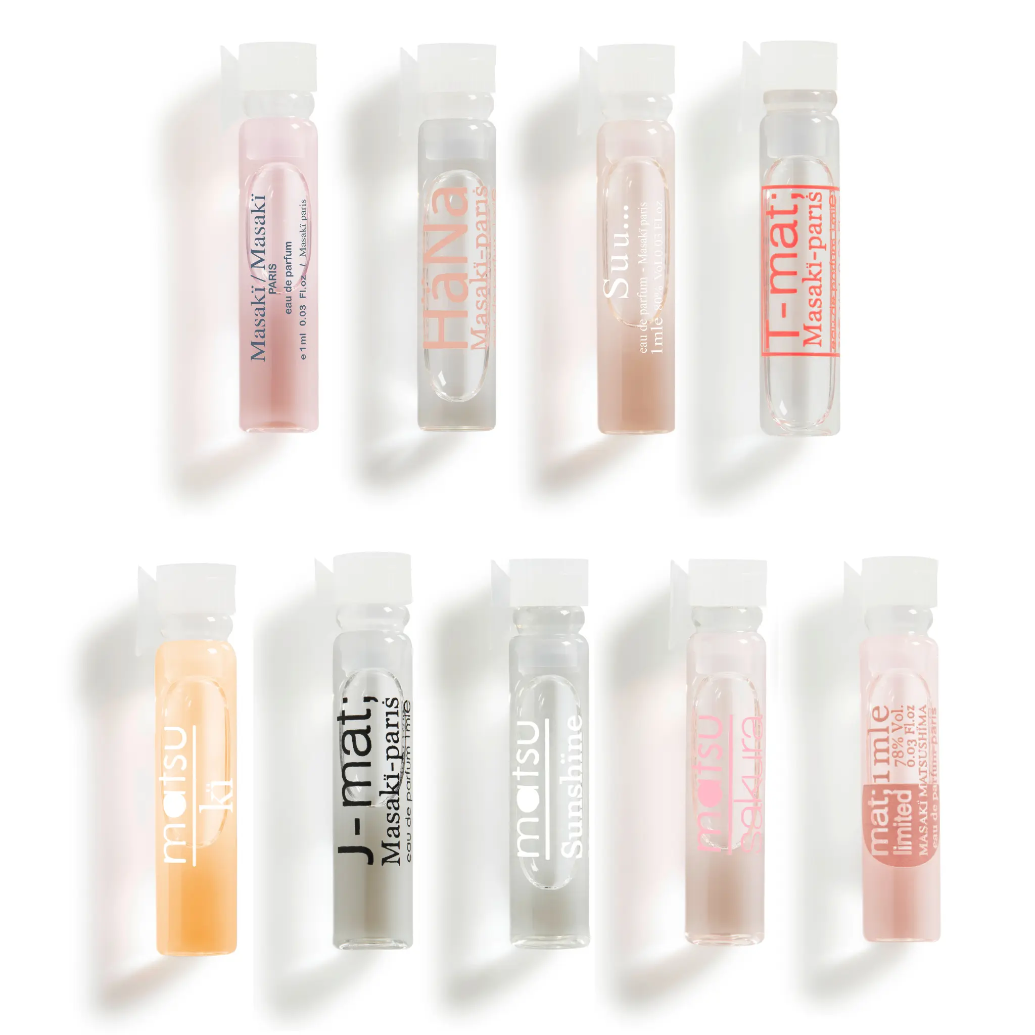 Our Discovery Set For Her includes 1ml / 0.03 oz samples of Matsu Kï, HäNa, Suu…, mat; limited, Matsu Sakura, Matsu Sunshïne, Masakï / Masakï, T-mat;, and J-mat;.